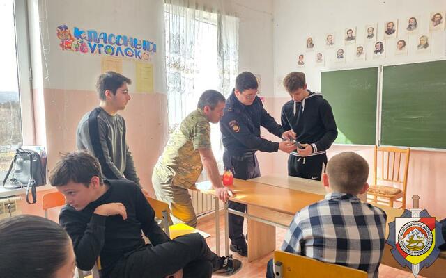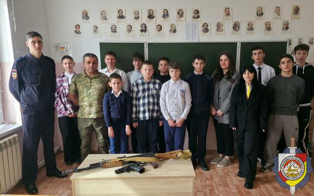 Участковый уполномоченный и инспектор по делам несовершеннолетних УВД Знаурского района продемонстрировали учащимся школы села Балта устройство автомата АК- 74 и пистолета Ярыгина.