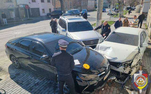 Дорожно-транспортное происшествие произошло утром на улице 8-го Июня. Водитель автомашины Toyota Mark X, жительница Цхинвала, не справилась с управлением, вылетела на тротуар и врезалась в стену жилого дома. От удара Mark X отбросило в сторону, где он столкнулся с двумя припаркованными автомобилями Lexus GX и Toyota Camry.